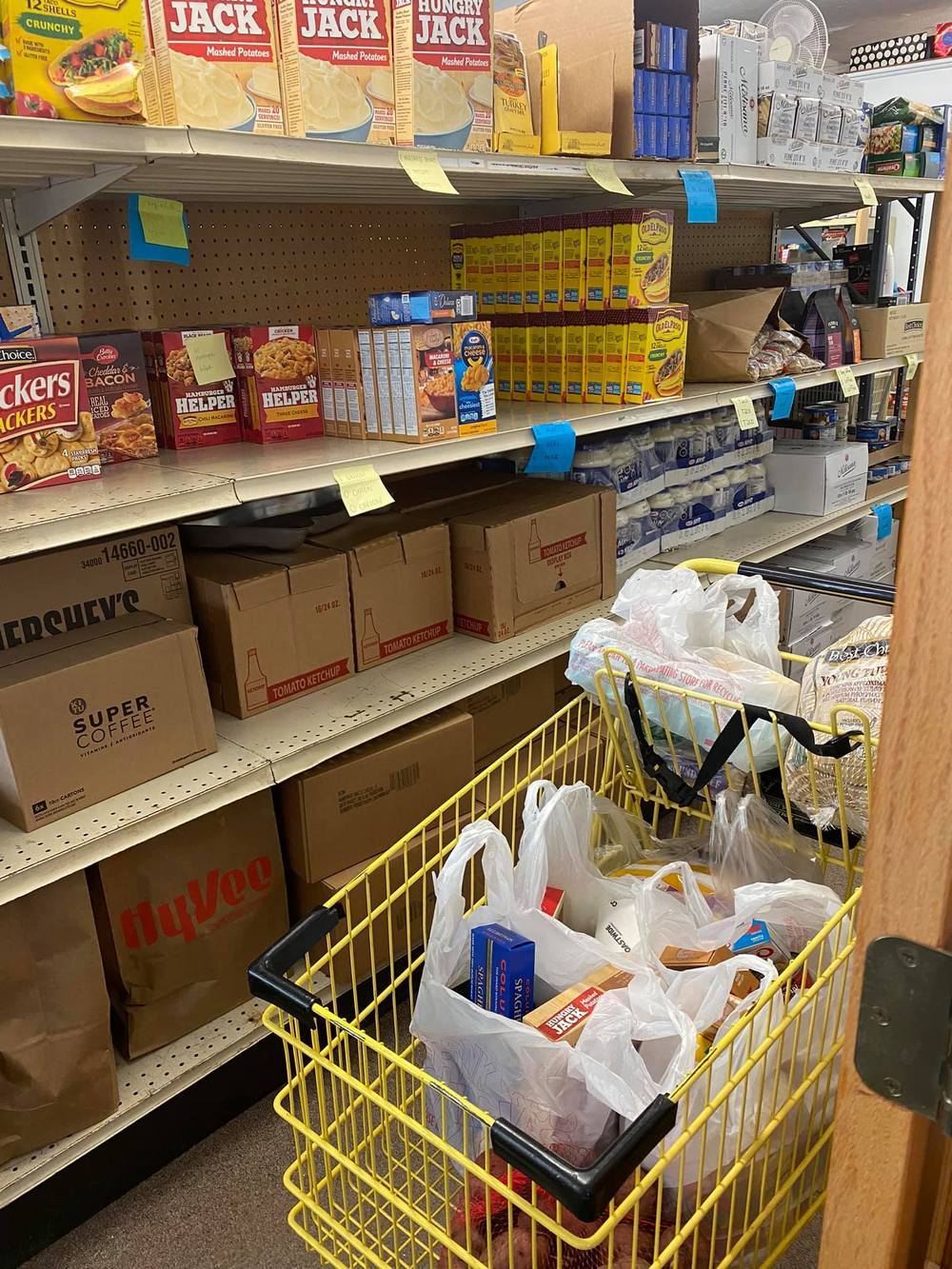 The Breadbasket is funded solely by donations from individuals and businesses in Moody County. Clients of the Breadbasket receive a large amount of food once a month. Clients get a cart full of food that changes every month, but always includes meat, kitchen staples like peanut butter, eggs, milk, and canned goods.