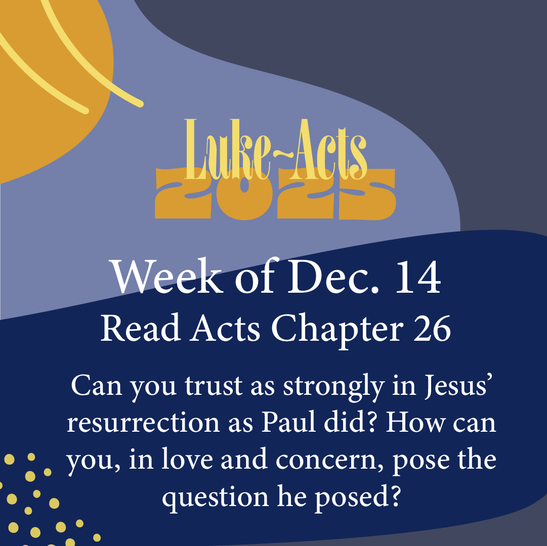 We sometimes say, “God doesn’t call the equipped.” It’s true that God isn’t dependent on our human abilities or credentials. But Paul’s final journey showed God using Paul’s training as a Pharisee, his Roman citizenship by birth, and his passionate Christian witness—a strikingly unique set of attributes that Peter, John or James would not have had. What qualities do you bring to your service for God that may allow you to serve in ways others might not be able to? Additional resource: Acts 26